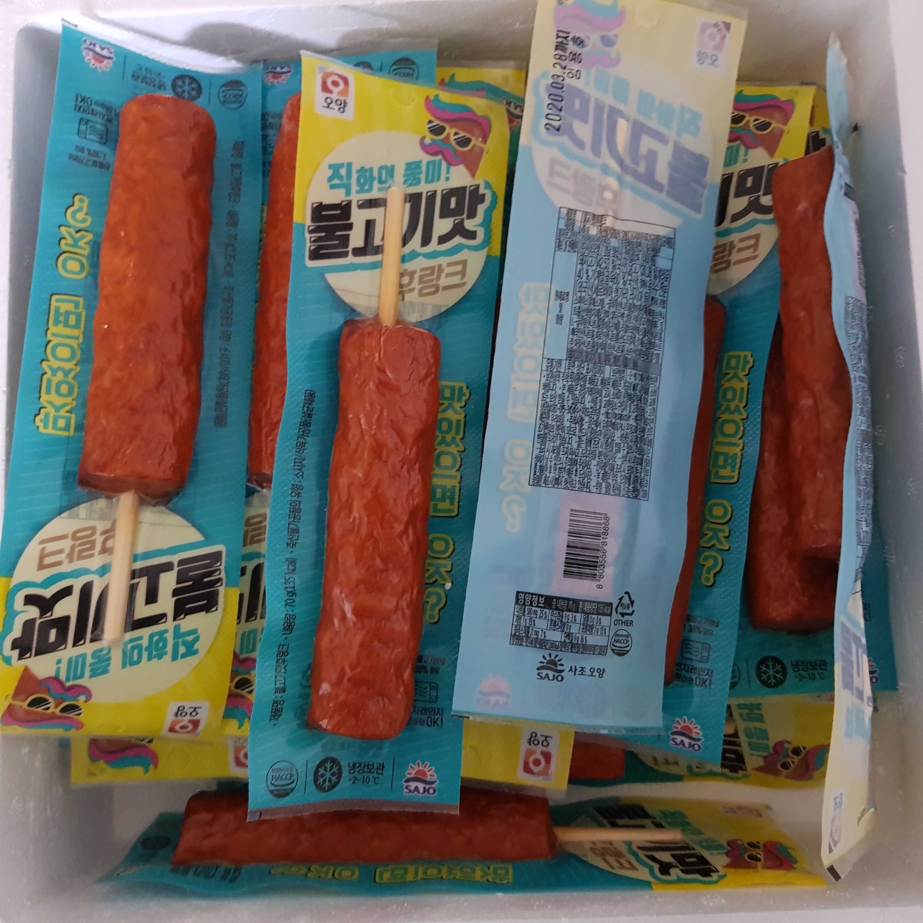 아이스박스를 개봉하니 맛있게 생긴 핫바들이 가득들어있었어요. 사조오양 불고기맛 후랑크를 20개 신청했는데 2개가 서비스로 더 왔더라구요. 2개를 서비스로 주니 괜히 기분이 좋아졌어요.