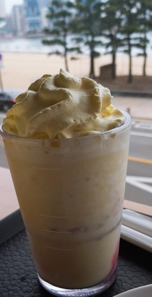 위에 휘핑크림은 슈 크림이여서 정말 정말 맛있더라구요. 안에 딸기 다이스들도 총총 들어가있어, 씹는 맛이 있더라구요. 달달하면서도 딸기를 씹으니 살짝 새콤한 맛이 나서 물리지가 않고 정말 맛있었어요. 적다보니 또 마시고 싶네요~