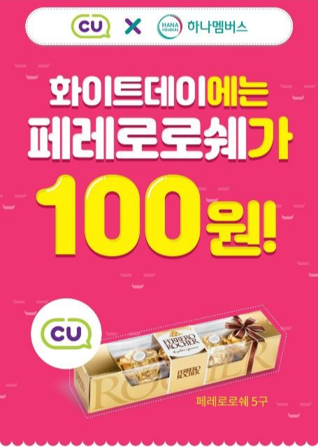 CU와 하나멤버스가 합작해서 3월1일부터 14일까지 페레로로쉐가 100원에 판매하는 이벤트를 한다고 합니다.