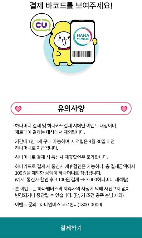 하나머니 결제 및 등록된 하나카드로 결제시에만 이벤트 대상이며 제로페이 결제는 대상에서 제외된다고 합니다. 기간내 1인당 하나라고 하니 참고하시기 바랍니다.