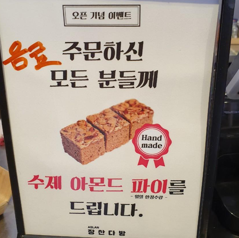 센텀 홈플러스의 장산다방의 신규오픈 이벤트로 장산다방에서 음료 주문시 일 선착순 200명까지, 수제 아몬드파이를 준다고 합니다!