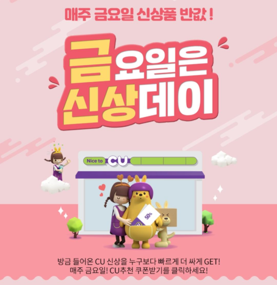 마지막으로, 매주 금요일은 CU 신상데이라고 합니다! 매주 금요일 오전 11시에 선착순으로 1만장의 쿠폰을 준다고 하니, 여러분도 한번 도전해 보세요!