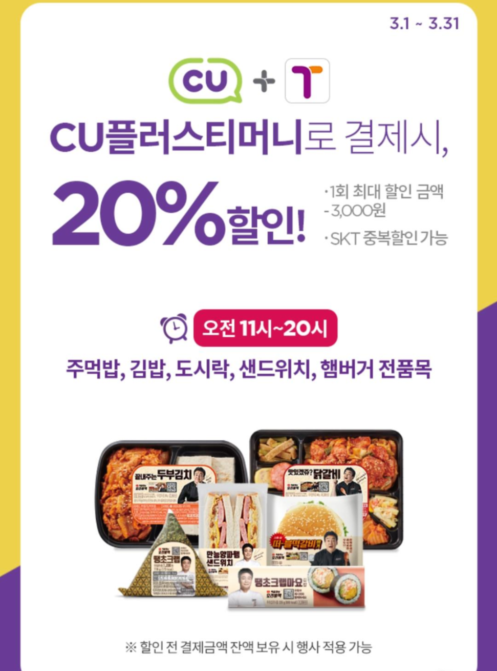 다음 이벤트는, CU플러스티머니 결제시 20퍼센트 할인된다고 하는데요. SKT와 중복할인도 가능하다고 하니, CU 플러스 티머니 사용하시는 분은 오전 11시부터 오후 8시까지, 한번 이용해 보시는 것도 좋을 것 같습니다.