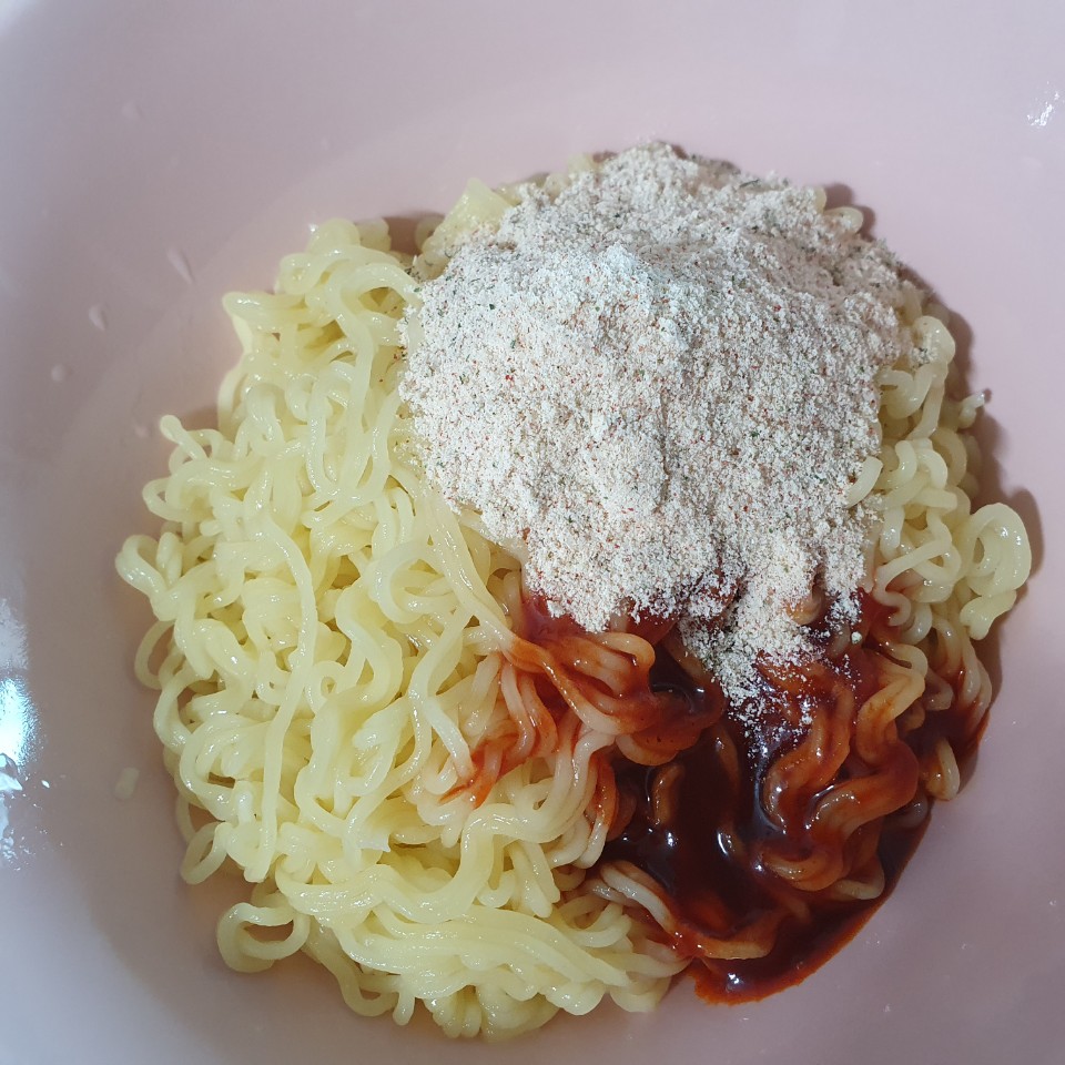 2)찬물에 면을 헹구고 물기를 뺀 후 액상스프, 크림분말을 넣고 비빕니다.