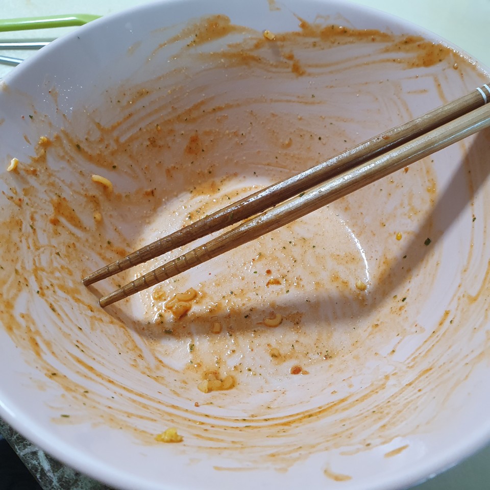 비비크림면을 그냥 먹을때 보다 비비면에 계란이 들어가니가 풍미가 더 있고, 매운맛을 좀 완화시켜줘서 더 맛있게 먹었다며 깨끗하게 클리어 했네요. ㅎㅎ