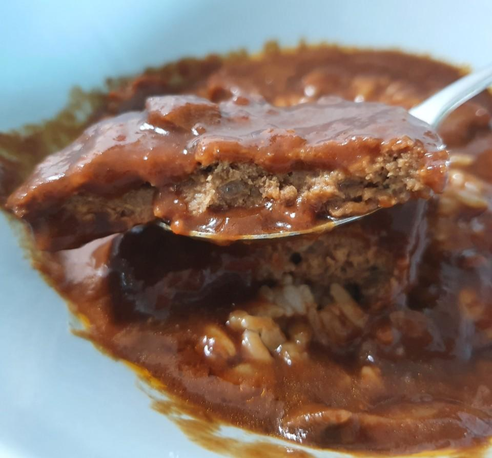 저는 1회 용기는 사용하지 않고 집에 있는 그릇에 밥을 담고 패티를 올리고 소스를 부었습니다.