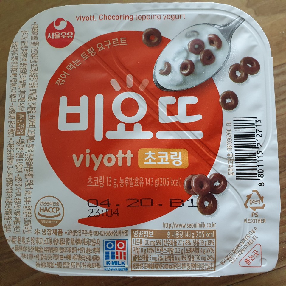 비요뜨 초코링은 꺽어 먹는 토핑 요구르트입니다. 농후발효유143g이며 칼로리는 205kcal입니다. 칼로리가 높은 것 같아 하나 이상은 먹으면 안 될것 같아요.