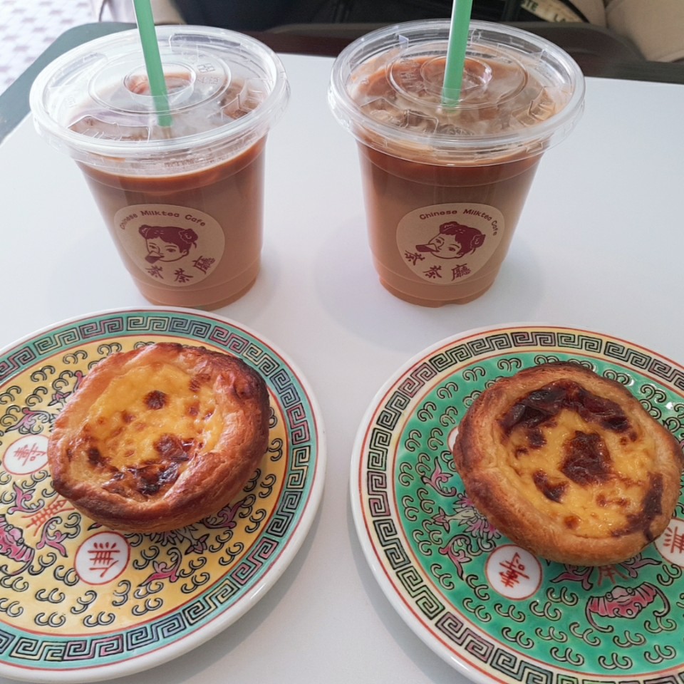 주문한 홍콩식 전통 밀크티와 마카오식 에그타러트가 나왔습니다. 접시가 홍콩분위기를 연상 시키네요.