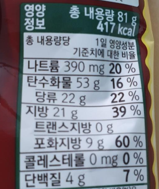 총 내용량은81g이고 칼로리라 417kcal예요. 역시 과자는 칼로리가 높아요. 맛있게 먹을땐 0칼로리라고 하니 맛있게 그냥 먹었어요.