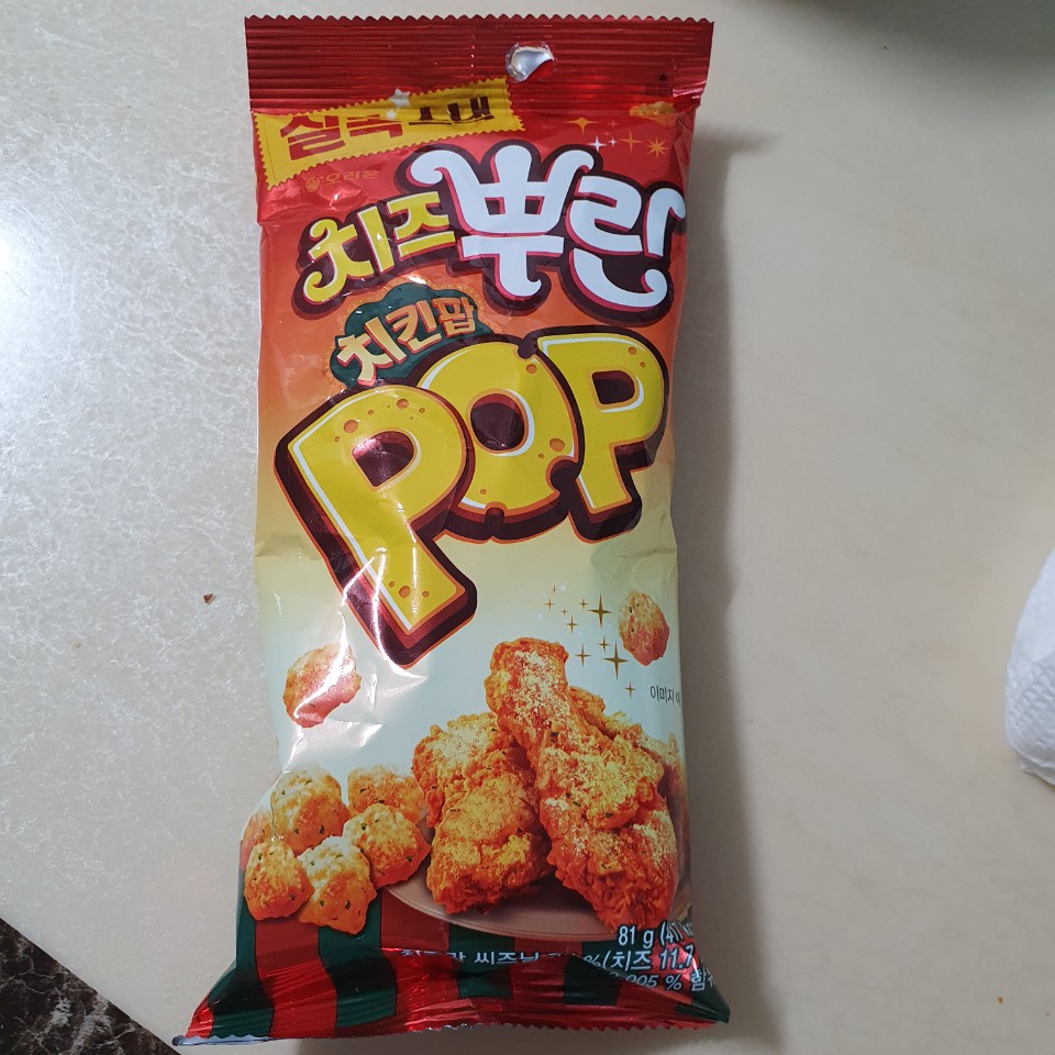 실속스낵이라고 적혀있네요. 사실 요즘 과자 가격이 정말 비싸긴해요. 그렇다고 양이 많지도 않고 공기가 반이상을 차지하지만 치즈뿌린 치킨팝은 실속답게 3/2정도 들었더라구요. 가격은 1000원입니다.