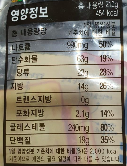 내용물은 210g인데 칼로리는 454kcal예요.