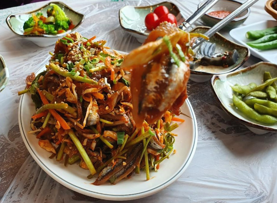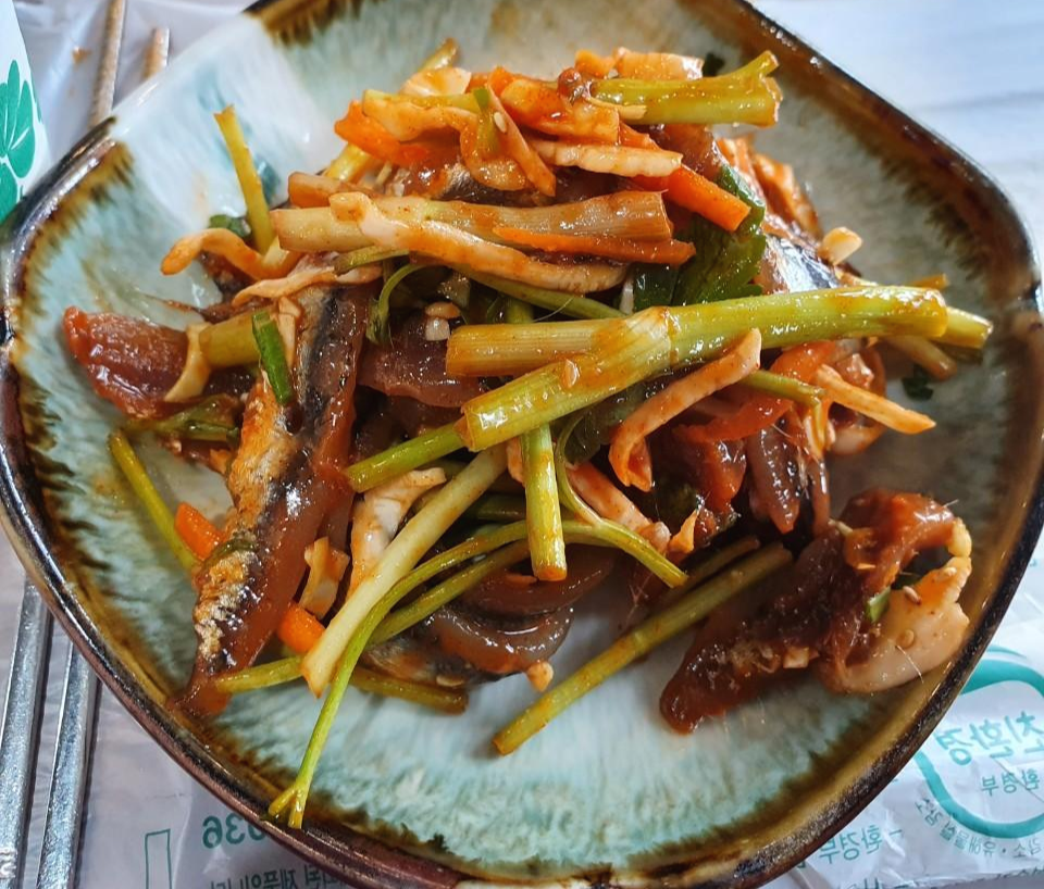 드디어 멸치회무침이 나왔습니다. 멸치와 미나리, 양배추, 파등 각종 야채를 넣어 새콤달콤하게 무쳤더라구요.