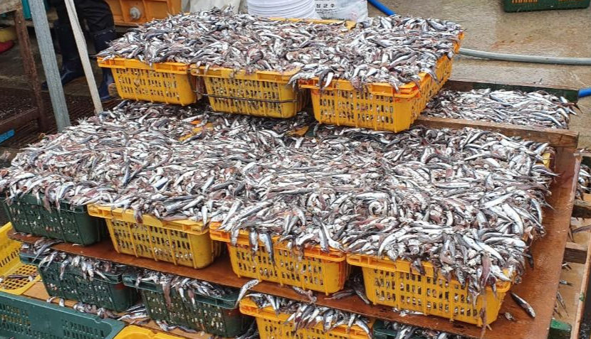 갓 잡아서 온 멸치들이 가게마다 배달되고 있었어요.