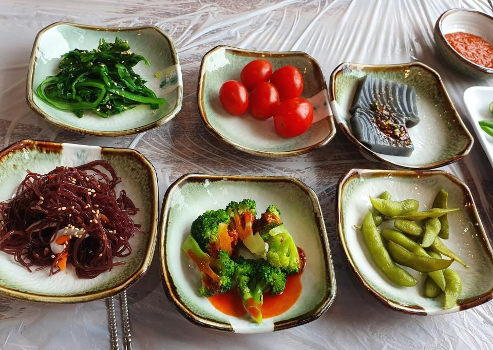 기본 밑반찬으로 브로콜리 초장무침이랑 깻묵, 나물, 방울토마토, 완두콩 등이 나왔습니다