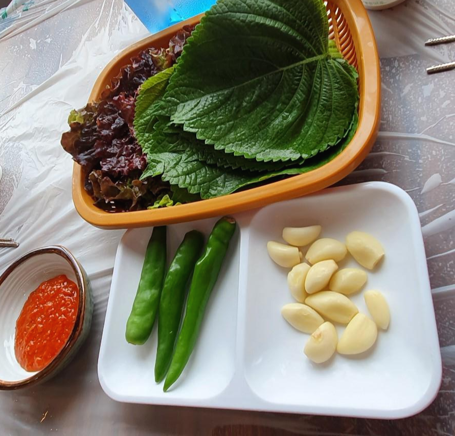 멸치회와 쌈싸먹을 수 있게 상추와 깻잎, 마늘, 고추랑 쌈장이 나왔어요.
