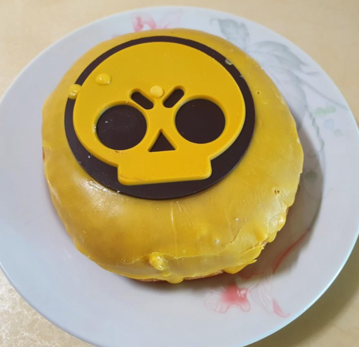 브롤스타즈를 상징하는 심볼 해골 모양 초콜릿이 올라간 바나나 향 링 도넛입니다. 가격은 1900원