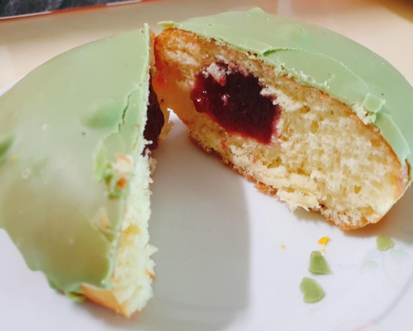 스파이크 필드 도넛을 반으로 잘랐더니 보이시죠. 딸기쨈 살짝 당황했네요. 빵크기에 비해 너무 적게 들어간 딸기쨈