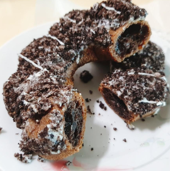 오레오 화이트츄이스를 잘라보니 겉은 바삭한 오레오 쿠키 가루가 듬뿍 있고 속은 초코맛이라 쫀득쫀득 식감에 맛이 없을 수가 없어요.