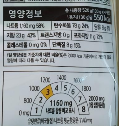 총내용량은(4봉)520g입니다. 칼로리는 1봉(130g)당 550kcal입니다. 나트륨이 높은 것 같네요