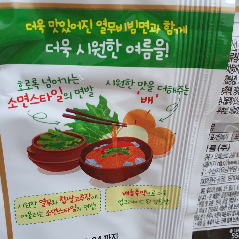 시원한 열무와 찹쌀고추장에 어울리는 소면스타일 면발로 호록호록 잘 넘어간다고 합니다, 거기다가 배농축으로 업그레이드 되어 감칠맛이 더해져 맛있어졌다고 하는데요. 사실 저도 열무 그림이 그려져 있길래 급 관심이 갔는데 딸아이가
