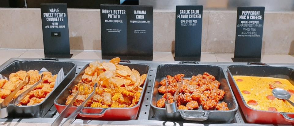 또 애슐리에서 유명한 것이 있다면, 치킨이죠. 하지만 기존 통살치킨은 없고 양념된 치킨만 있었어요. 양념은 정말 맛있더라구요! 메이플 스윗 포테이토 크로켓, 허니버터 포테이토, 더블베이크하바나콘등 도 있었어요.