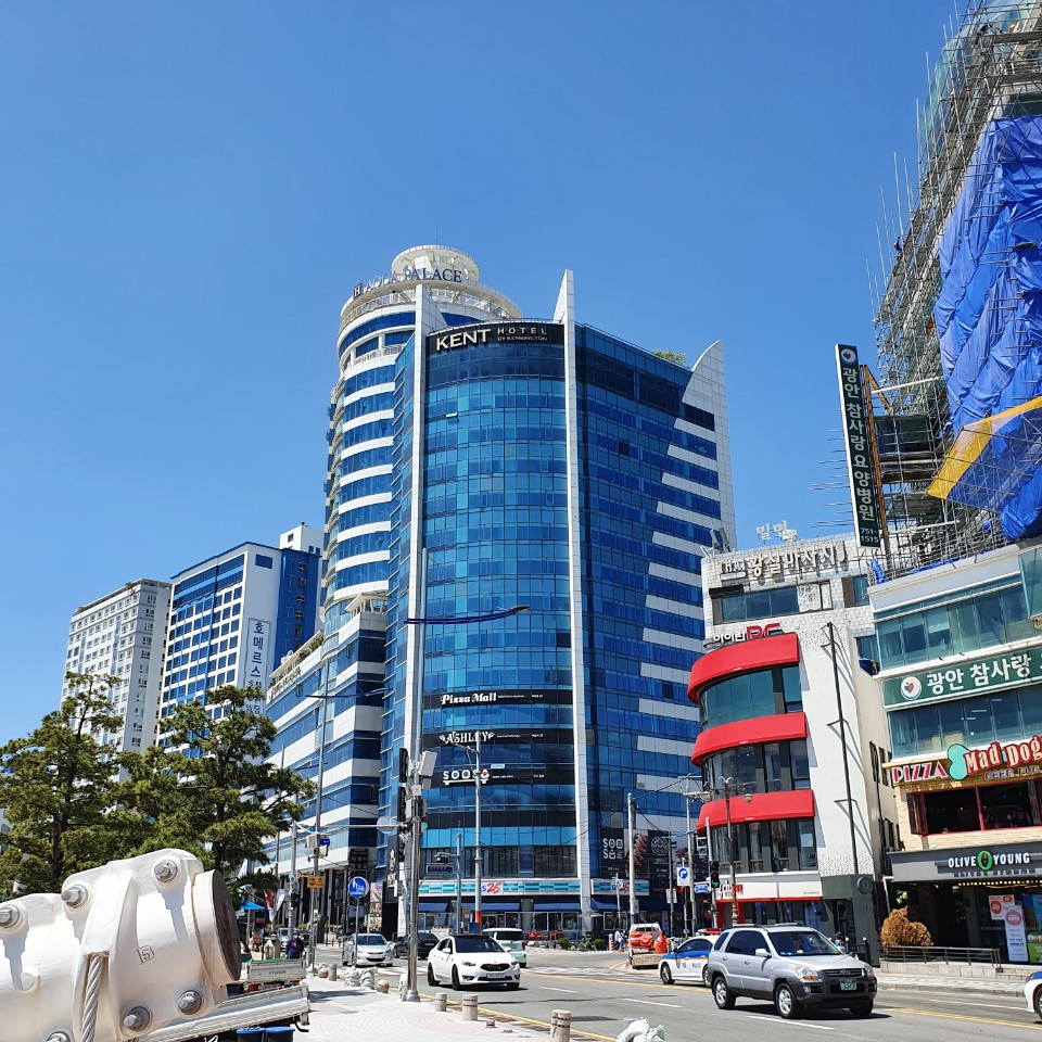 크게 보이는 KENT 호텔 건물에 애슐리 광안점이 있습니다.