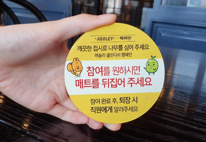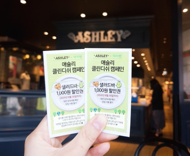 아참! 현재 애슐리에서는 "음식물 남기지 않기"라는 프로젝트를 하고 있어요. 입장하자마자 직원분께 말씀드리고 이런 카드를 뒤집어두면, 나중에 직원분께서 보시고 스크래치복권같은 카드를 줘요!