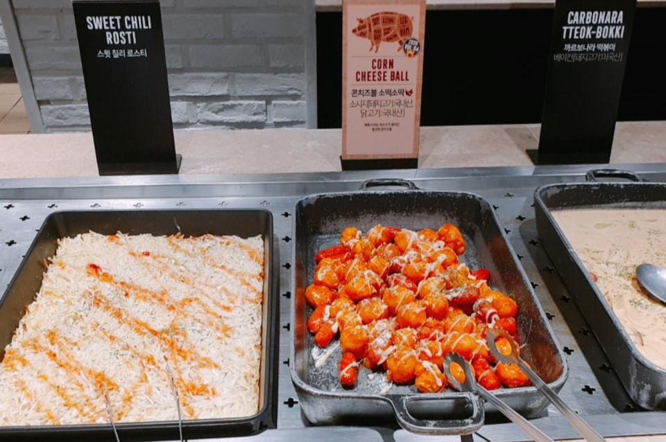 스윗칠리로스티,콘치즈볼, 소떡소떡, 까르보나라 떡볶이도 있어요. 소떡소떡도 맛있어서 열심히 먹었어요.