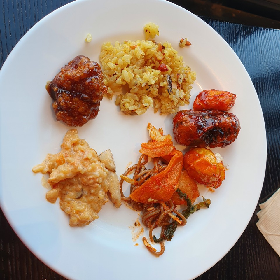 제가 앉은 자리에서 찍은 바깥 풍경입니다. 바다가 보이는 곳이었어요. 위에 사진처럼 날씨는 화창했는데 창가 안에서 찍었더니 미세먼지가 있는 것처럼 보였네요.