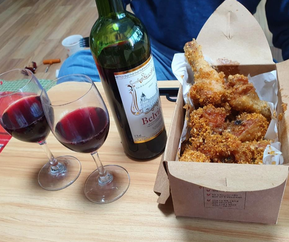 남편과 치킨을 먹으면서 와인을 함께 먹었어요. 확실히 와인보다는 맥주가 더 맛있는 것 같아요.