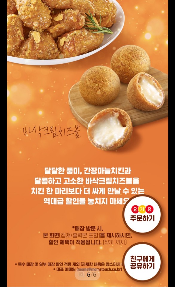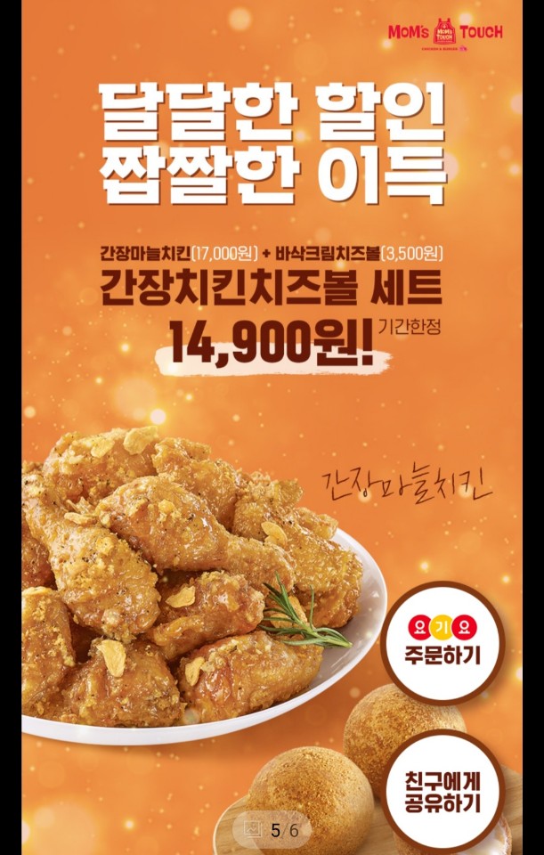 맘스터치에서 싸이버거만 즐겨먹었는데 인스타그램에서 맘스터치 기간한정으로 간장치킨치즈볼세트를 14900원에 할인한다는 광고를 보고 5월에 받은 지역화폐도 사용해볼겸 신메뉴라 맛도 궁금하기도 해서 사먹기로 했어요.