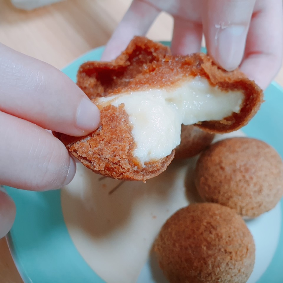 반으로 잘라보았어요. 달콤한 크림치즈가 듬뿍들었어요. 한 입 먹었더니 달콤하고 고소하니 맛있었어요.