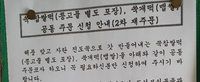 아파트 부녀회에서 해풍 맞고 자란 진도쑥으로 만들어 내는 쑥찹살떡(콩고물 별도 포장)을 공동으로 주문받는다는 소식이 있어 신청하게 되었습니다.