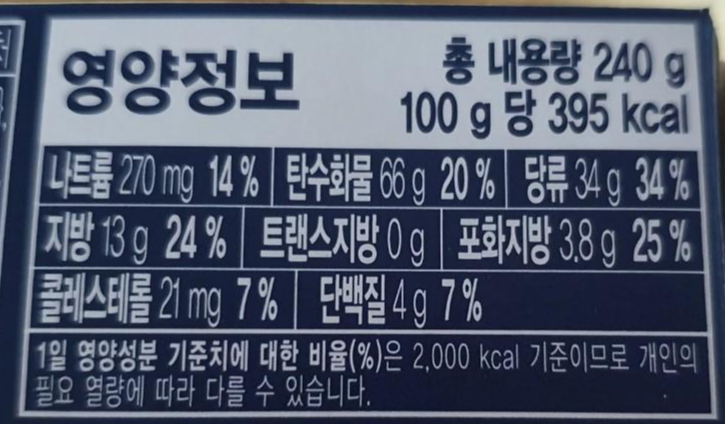 총 내용량은 240g 100g당 395kcal 총 칼로리는 950입니다, 맛있는 만큼 칼로리는 많이 나가네요.ㅎㅎ