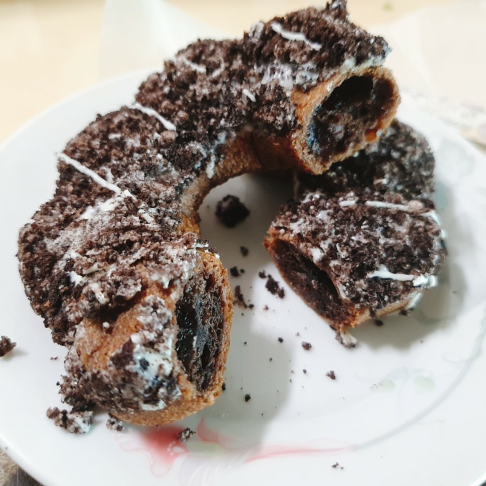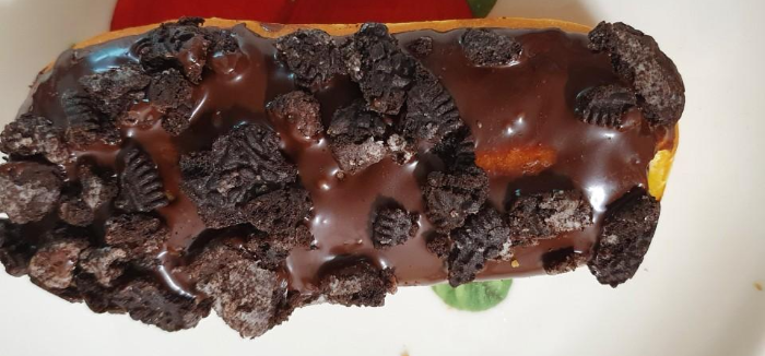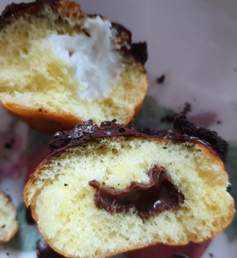 반을 잘라 보니 다크 초코와 크림이 들어있었어요. 빵은 부드럽지는 않고 퍽퍽한 느낌 겉이 초코라 맛있긴 했어요.