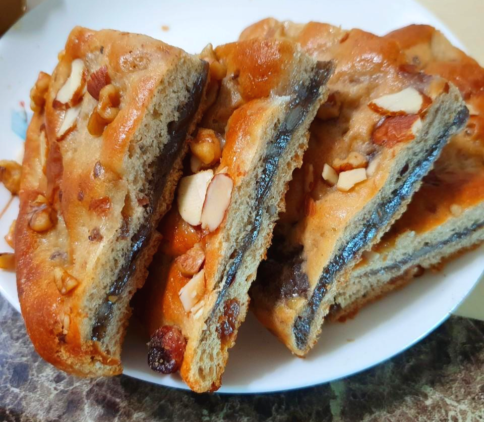 겉에는 아몬드, 호두등의 견과류가 듬뿍 토핑되어있고 속은 찹쌀이 들어가 쫀득하고 고소한 빵입니다. 보기에도 건강한 빵 같이 보이죠. 빵이 떡먹는 기분이 들어 호불호가 있긴한데 견과류를 좋아하신다면 좋아할 것 같아요.