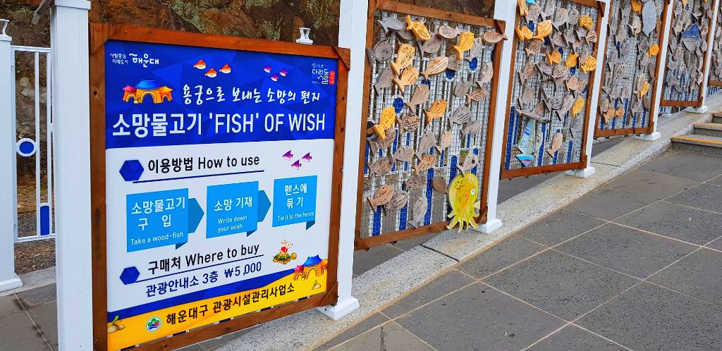 많은 사람들이 소망을 적어 용궁으로 보내려고 팬스에 가득 매달아 놓았어요.