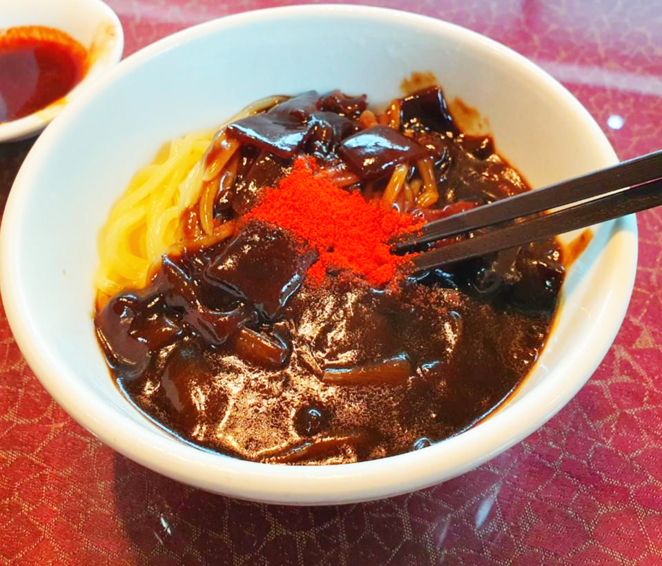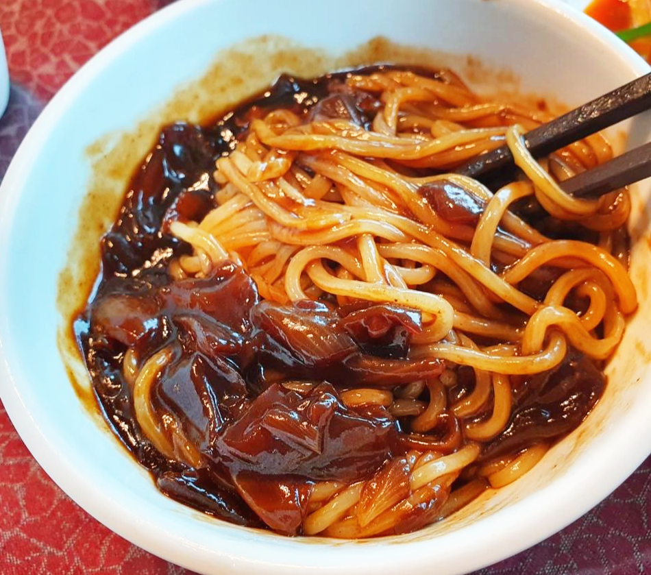 마지막으로 나온 코스요리 짜장면입니다. 짬뽕으로 바꾸면 천원이 추가된답니다! 하지만 저를 포함한 5명은 이 집 짜장면을 좋아해서 ㅎㅎ 짜장면으로 시켰어요. 매콤한 걸 좋아한다며 저 빼고 다들 고춧가루를 넣어 비벼 먹었어요.