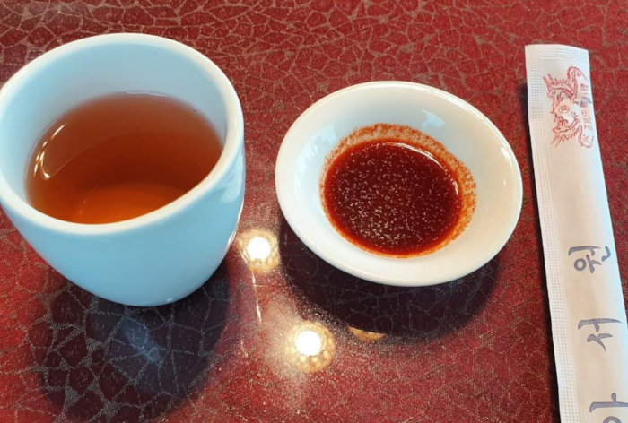 중국집 하면 빼놓을 수 없는 따뜻한 차와 탕수육에 찍어 먹으면 맛있는 간장도 함께 나왔어요.