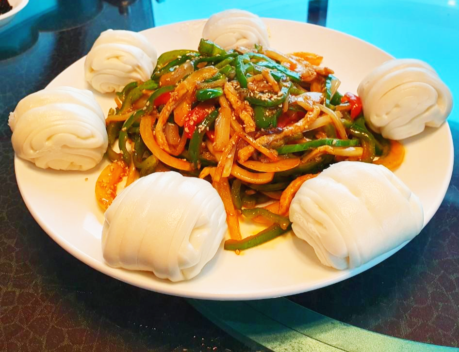 다음 메뉴는 고추잡채와 꽃빵이예요. 저는 사실 고추잡채 별로 안좋아하거든요, 그래서 안먹으려고 그랬는데 딸이 한번만 먹어보라고 그러더라구요 그래서 먹어봤는데, 왠걸, 너무 맛있는거예요! 야채와 고기가 불에 잘 볶아져 불맛과 짭조름한 맛을 같이 어울어져서 내니, 배부른데도 계속 먹었어요. 저희 아들 사실 피망 안먹는 아이인데, 고추잡채가 오늘 먹은 거 중 가장 맛있다고 하면 끝난거 아닌가요?ㅎㅎ