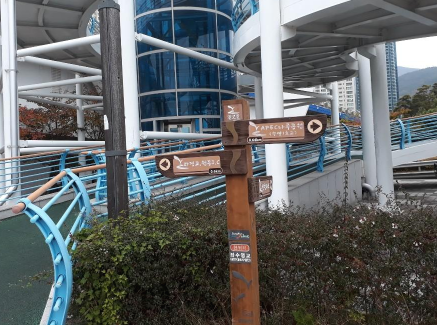 우리가 걸은 구간은 강변코스로 8-2코스 동천교> 원동교>과정교> APEC누리공원>민락교까지 구간으로 약 2시간 걸리는 코스예요. 수영강을 끼고 걸어가는 코스로 난이도는 "하" 가장 쉬운코스예요