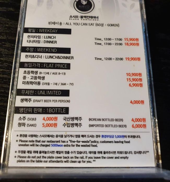 스시오 블래컨테이너 회전 초밥과 샐러드바를 무제한으로 이용할 수 있는데 시간은 1시간으로 정해져있어요. 성인 기준 평일 런치는 15900원, 평일디너는 18900원, 주말/공휴일은 19900원입니다.