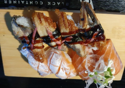 유부연어입니다. 유부 속에 연어기 들어간 초밥이라 색다르게 먹었습니다. 아쉽다면 밥양이 너무 많았어요.