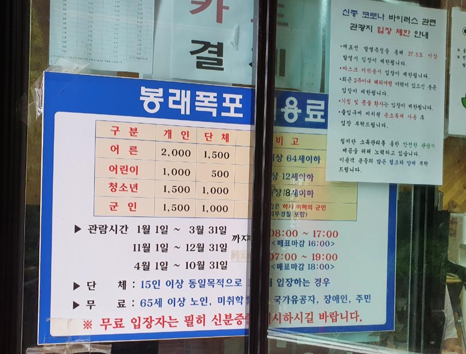 봉래 폭포 입장료는 2000원인데 19일까지 50%할인 가능해서 1000원에 표를 샀습니다. 관람시간도 계절마다 다르니 참고하시고 가을까지는 매표마감은 19:00까지라고 합니다.