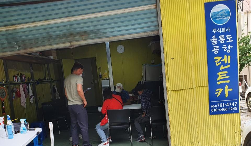 배가 출렁걸려 2시간 30분보다 30분 더 걸려 3시간을 타고 울릉도에 도착하니 코로나19 때문에 체온 체크 부터 하고 들어갔어요. 저희가 예약한 울릉도 공항 렌트카차가 저희를 마중 나와 계시더라구요. 저희는 노란 차를 타고 공항렌트카 사무실까지 갔어요. 직원분이 친절하게 설명해주셔서 하루에 7만원씩 4일간 지불하고 일요일날 반납하는 걸로 하고 차를 빌렸어요.