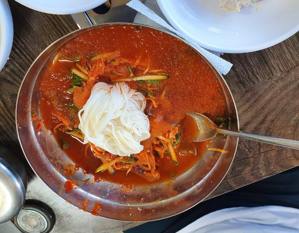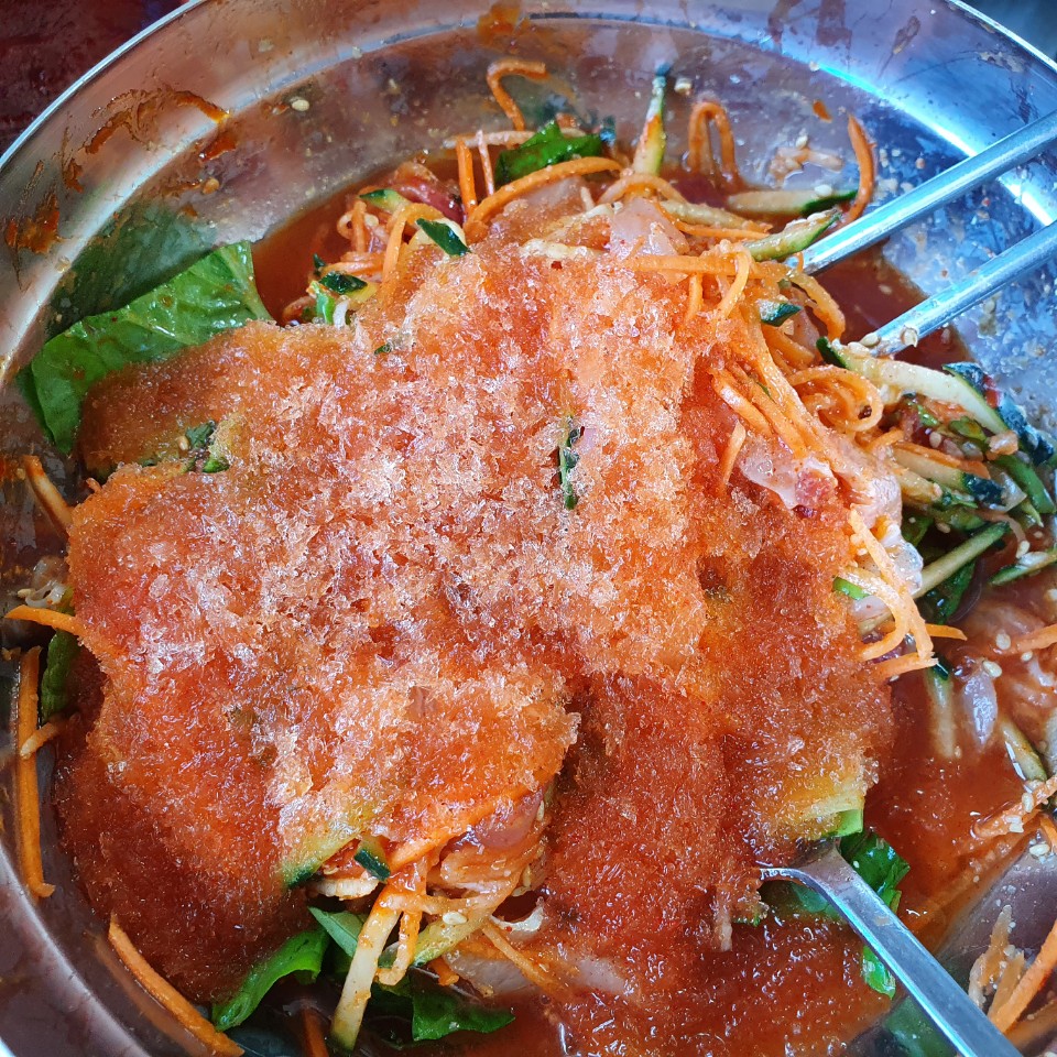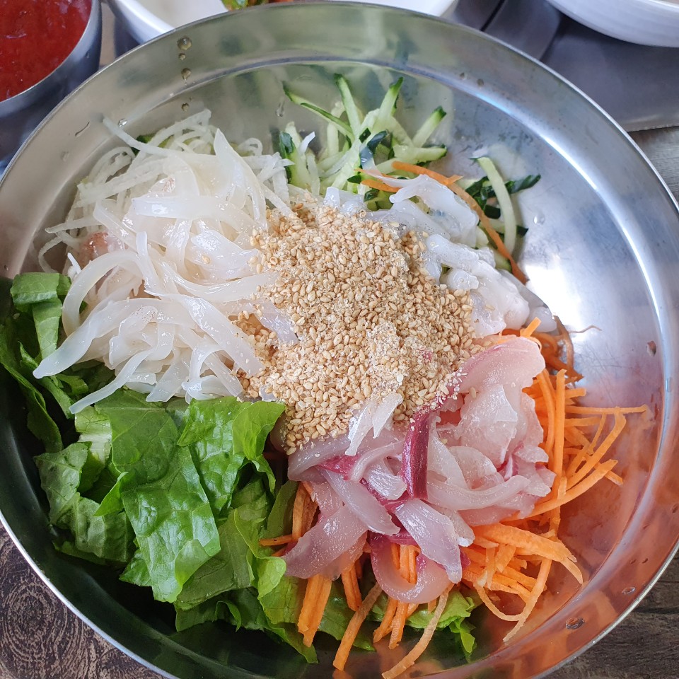 육수를 골고루 섞어 싱싱한 회를 먼저 먹고 그다음에 소면을 넣어 먹으면 맛있다고 합니다. 한입 먹으니 새콤달콤 정말 시원하면서 맛있었어요.