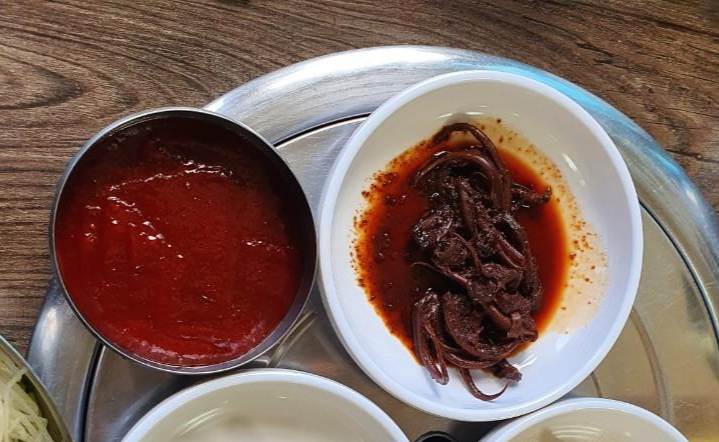 특이하게 고추장이 나왔습니다. 고추장으로 뭐할까 생각했는데 쓰임이 따로있더라구요. 고추장 옆에 나온 반찬은 오징어 절임인것 같은데 특이하고 맛있었습니다.