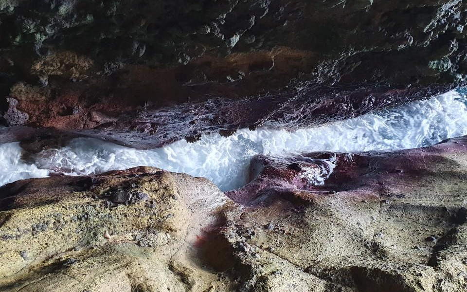 해식동굴은 암석의 연약한 부분이 파도에 깎여 나가 만들어진다고 합니다. 이곳에서 뜨거운 마그마가 기존 암석을 뚫고 올나와 식으면서 주변 암석에 많은 틈이 만들어지고 이틈을 따라 파도에 계속 깎여나가 동굴이 되었다고 합니다.