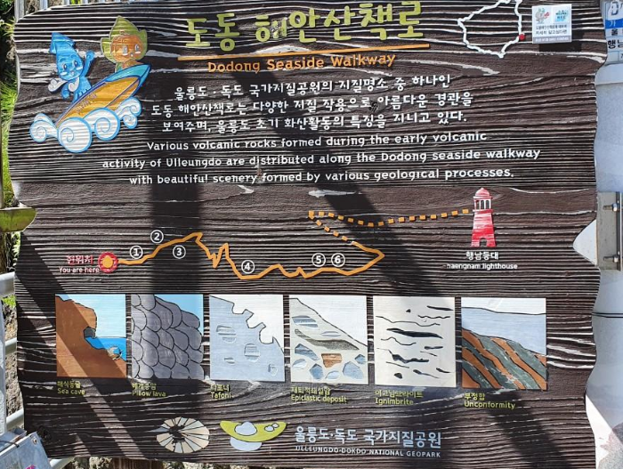 도동 해안산책로는 울릉도 초기 화산활동의 특징을 간직한 다양한 지질구조가 관찰됙도하며, 도동항에서 도동등대로 갈수록 암석 생성연대가 대체로 젊어지는 경향을 보인다고 합니다.