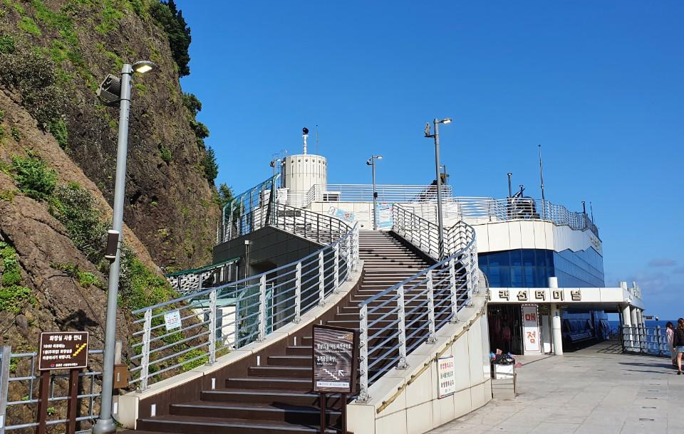 저동항에 있는 맛집 동백식당에서 점심을 푸짐하게 먹고 배가 부르기도 하고 해서 도동항 해안산책길을 걸어보기로 했어요. 도동 여객선 터미널 지하에 차를 대고 엘리베이트를 이용하여 4층을 올라왔습니다.